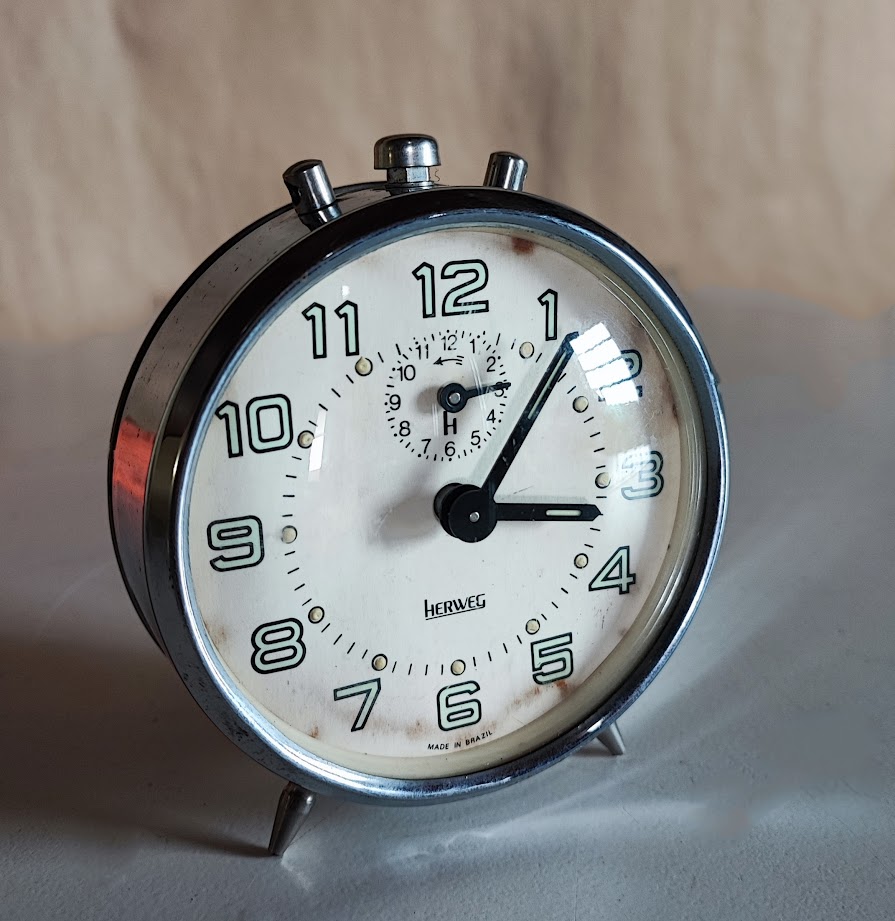 Esse relógio de mesa com caixa em metal cromado, proteção do mostrador em vidro. Despertador precisa de revisão na corda.